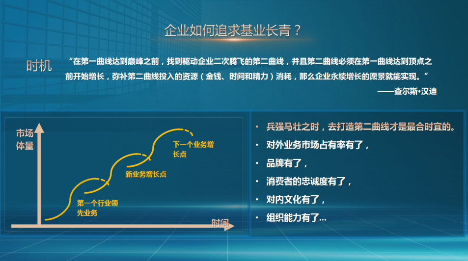杨鸥围绕房地产发展规律探究、第二增长曲线原理、房地产业向新发展模式转型策略等进行了专业分享,并重点就第二增长曲线业务案例进行多维度解读。他指出,当前房地产有三个趋势:第一是市场分化,第二是行业分化,第三是企业分化。对于一个行业而言,连续性创新仅是延缓衰落,并不能改变行业利润下降、整体走低的结果,若能在最短的时间内找到第二条线,打破了布局点,就能实现企业的再一次迅速发展。