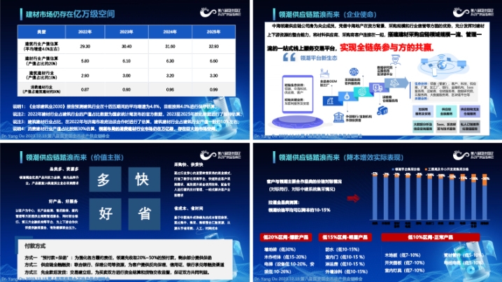 作为国民经济的“顶梁柱”之一,领潮供应链积极履行央企担当发挥产业链核心企业作用,于今年11月3日举办了以“聚势、创新、共赢”为主题的生态伙伴合作大会,旨在与生态伙伴携手打造行业领先的“公共平台”,赋能上下游企业,同时欢迎新的生态伙伴与领潮供应链一起构建建材行业新生态,通力践行绿色低碳的国家战略航向。未来将通过供应链价值再造,撬动管理杠杆,在绿色高质量转型路径上打赢提质增效的攻坚战。